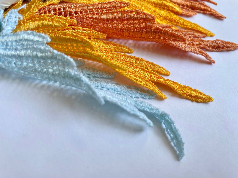 Turn heads without weighing your ears down. These one-of-a-kind statement earrings are crafted from hand-dyed lace sourced from vintage fabrics, giving them a unique texture and character you won’t find anywhere else. Inspired by the vivid feathers of a parrot’s wing, they bring bold color and movement—without the fragility of real feathers.
