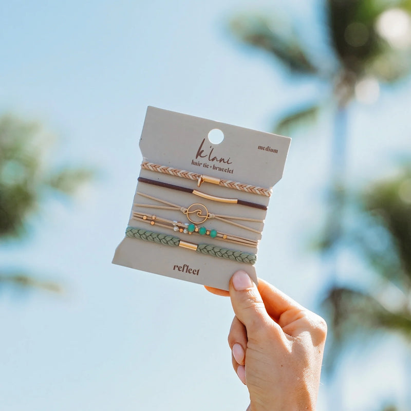 The Reflect set brings the peaceful energy of the beach to your style. These 5 hair tie bracelets are the perfect accessory made of earthy neutral and soothing green colors to remind you to calmly go with the flow as you reflect on what really matters.