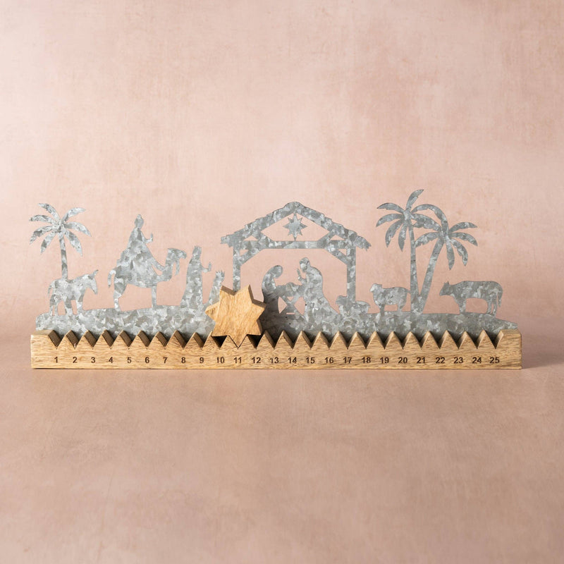 Celebrate the season with this beautifully designed Advent calendar. A mango wood base features numbers 1–25 and a movable star to mark each day. A galvanized metal nativity scene rises in silhouette behind the countdown, blending rustic charm with spiritual tradition. The contrast of natural wood and cool metal gives this piece a timeless look that suits any mantel or tabletop display. A thoughtful gift or heirloom in the